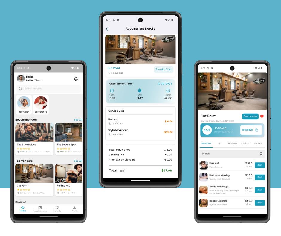 Discover amazing features that make booking appointments easier than ever. Browse services, read reviews, and manage your bookings all in one place. Get instant notifications, track your appointments, and enjoy seamless experience with our user-friendly mobile application.